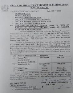 ایڈمنسٹریٹر بلدیہ شرقی رحمت اللہ شیخ ومیونسپل کمشنر فہیم خان نے افسران کو متوقع برسات سے نمٹنے کی ہدایات