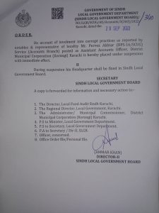 بلدیہ کورنگی کے اسسٹنٹ اکاؤنٹ افسر کو معطل کر دیا گیا
